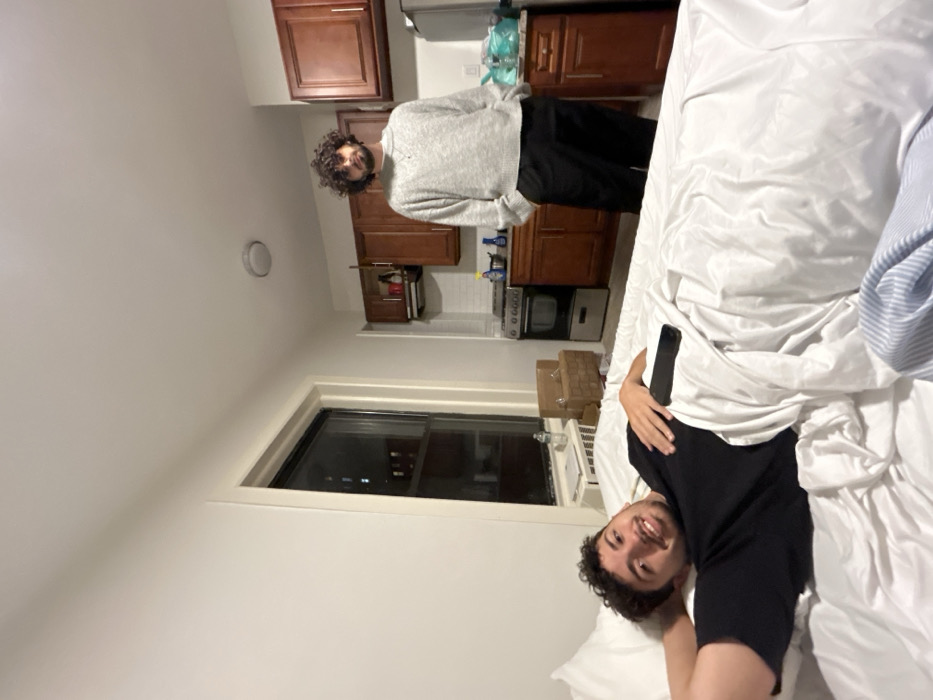 The image depicts two males inside a small apartment or studio in a residential area of New York City, United States, during nighttime hours. In the immediate foreground, a male subject with dark, curly hair and facial hair (mustache and light beard) is lying on his back in a bed, covered by white bedding. He is wearing a black t-shirt, smiling, and looking directly towards the camera. A black smartphone is visible on the white bedding near his right hand. In the mid-ground, a second male subject with dark, curly hair and a full beard stands upright within a compact kitchen area integrated into the living space. He is wearing a light grey long-sleeved sweater and dark pants, with his hands positioned either in his pockets or clasped in front of him. He also looks directly towards the camera with a neutral expression. The apartment features plain white walls and ceiling. To the left of the image, a window with a dark frame reveals a nighttime outdoor scene, with distant lights from other buildings visible. Below the window, a white radiator or air conditioning unit is present, alongside a stack of cardboard boxes. The kitchen area in the background consists of dark wooden upper and lower cabinets, a white tiled backsplash, a stainless steel gas range and oven with a range hood above, and a partial view of a stainless steel refrigerator on the far right. Various items, including bottles and containers, are visible on the kitchen countertop. The interior is illuminated by artificial lighting.