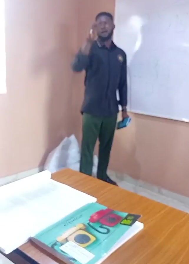 A man stands in front of a whiteboard in a room. He is wearing a dark long-sleeve shirt, green pants, and dark shoes. He holds a small dark object in his left hand and gestures with his right hand as he speaks. Behind him is a whiteboard with drawings on it. In front of him is a wooden desk with open books and papers on it. The walls of the room are light peach.