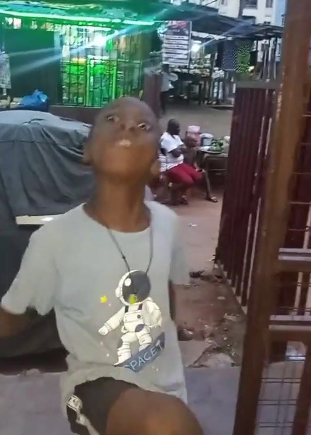 A boy is standing outside in front of a partially covered flatbed pickup truck and a building with green lights. In the background, there are people sitting. The boy is wearing a gray t-shirt with a drawing of an astronaut, black shorts, and a necklace. He makes exaggerated expressions. He covers his face with his hand and opens his mouth wide. He puts his finger in his mouth.