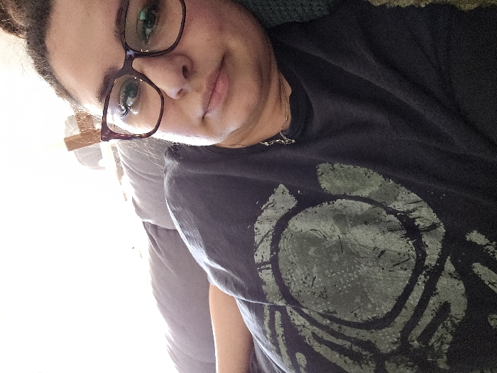 The scene is an interior setting located in Nuremberg, Germany. A single individual, an adult female, is depicted in a medium-shot, oriented towards the viewer. The subject has dark hair, styled upwards, and wears dark-rimmed prescription glasses. Her gaze is directed straight ahead. She is dressed in a dark-colored t-shirt featuring a distressed circular graphic design in a muted green hue on the upper left chest area. A thin gold-colored chain necklace with a small pendant and a second silver-colored necklace are visible around her neck. The individual appears to be reclining on a grey upholstered surface, likely a sofa or bed, a portion of which is visible behind her left shoulder. To the far right, a section of a dark green, textured fabric is present. The background behind the subject is overexposed due to a strong, diffuse light source, possibly a window, rendering details indistinct except for a faint, light-colored object in the upper center. The overall lighting on the subject's face and upper body is bright and relatively even.