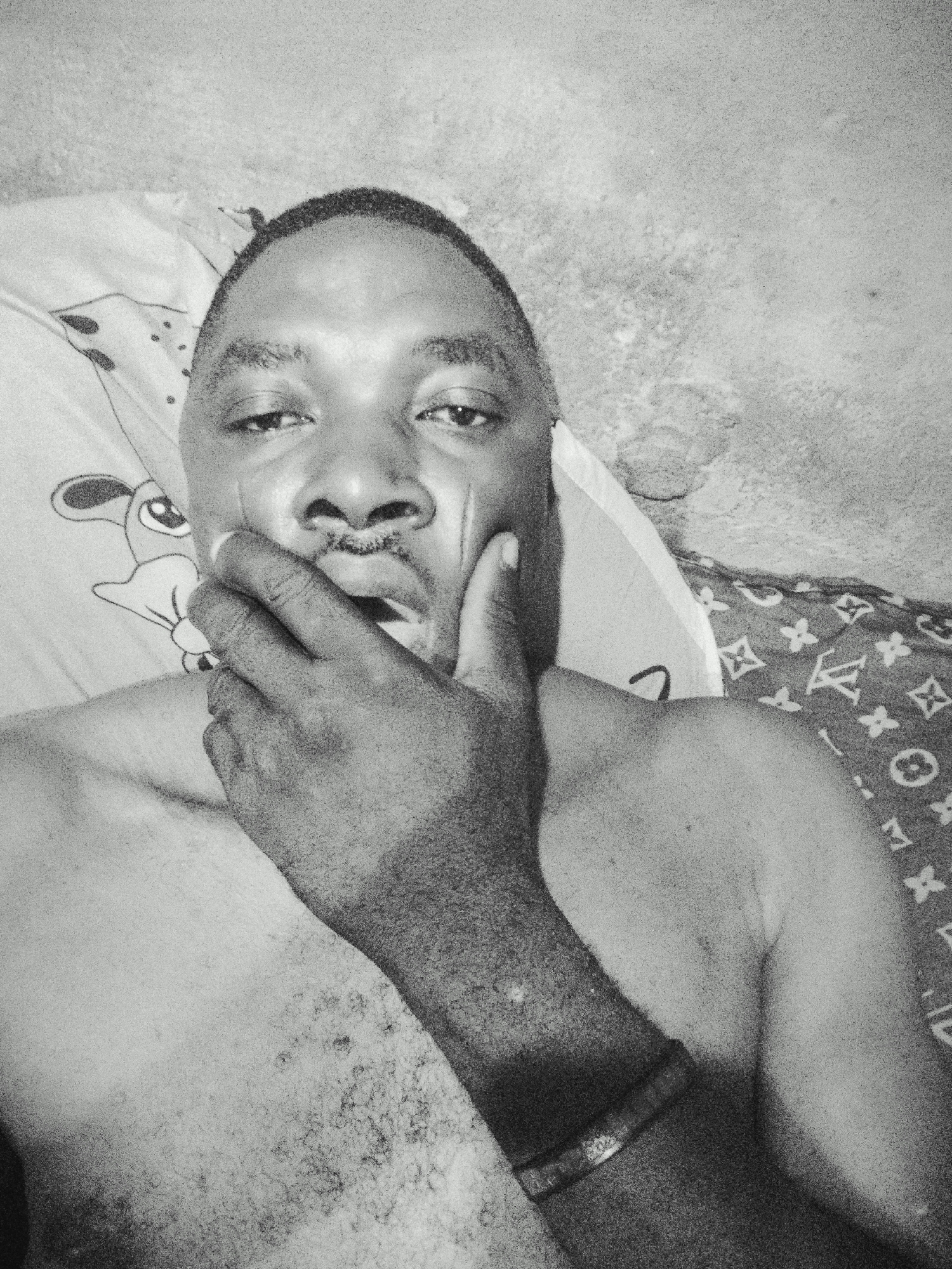 A black and white, close-up image depicts an adult male in an indoor setting, reportedly located in the city of Gawuna, Nigeria. The individual is positioned horizontally, appearing bare-chested from the mid-torso upward, looking directly into the camera. His right hand is raised, with fingers partially covering his mouth and chin. He has short hair and a sparse mustache. A dark wristband is visible on his left wrist. He is resting his head on a white pillow adorned with a cartoon character graphic, with a second, darker pillow featuring repetitive 'LV' style monograms visible to his right. The background consists of a light-colored, textured wall surface.