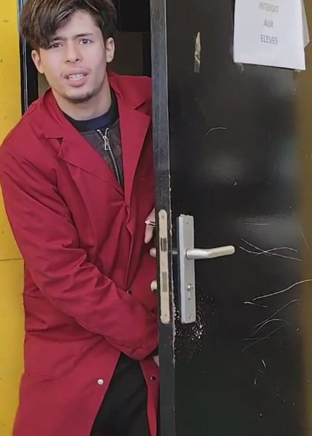 A young man with brown hair and a goatee, wearing a red lab coat over a dark zipper-front jacket, stands partially behind a black door with a silver handle. The door is slightly ajar. A sign above the door handle reads "INTERDIT AUX ELEVES" which translates to "PROHIBITED TO STUDENTS". The background is a dark hallway. The man is looking to his right and seems to be speaking.