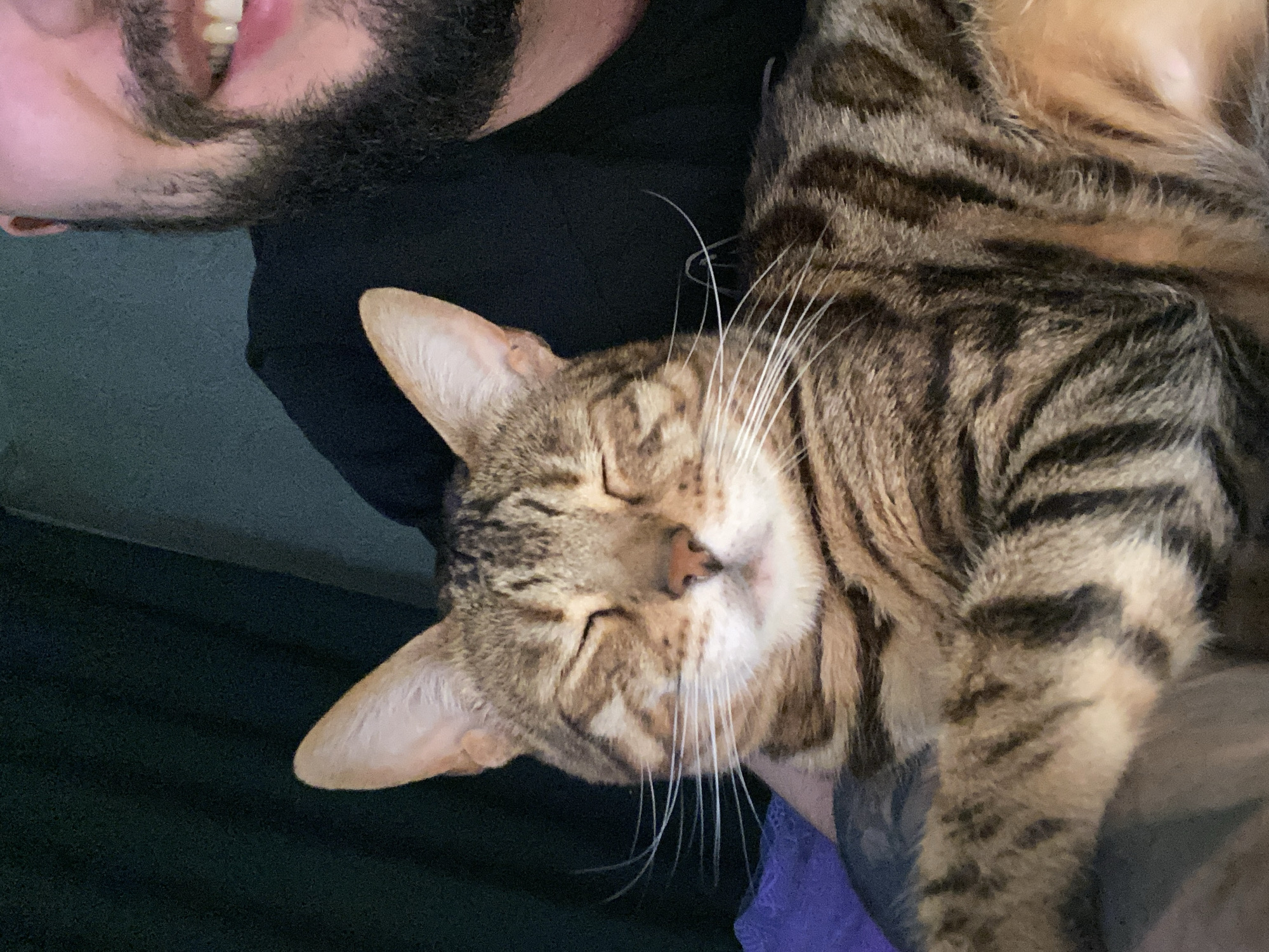 A man with a dark beard and visible teeth is holding a tabby cat
