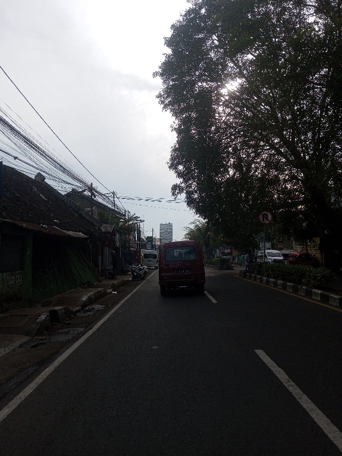 The image displays an urban street scene, purportedly in San Pya, Myanmar, viewed from the perspective of a vehicle on an asphalt road. The sky above is overcast and bright, with diffused sunlight visible through tree foliage on the right. On the left side of the road, a row of older, low-rise buildings with dark, corrugated or tiled roofs lines a narrow concrete sidewalk. A dense network of black electrical and communication wires is strung between utility poles above these buildings. Several individuals are present on the sidewalk, some partially obscured by shadow or distance, with at least two scooters parked near the buildings. One building section features green paneling. The road itself is a two-lane thoroughfare. A solid white line marks the left edge of the road, while a broken white line separates the lanes further down. A dark red minivan, possibly a Suzuki Carry, bearing an Indonesian license plate "B 1274 SAK" is positioned in the left lane, heading away from the viewer. Further in the distance, a white van and other vehicles are visible on the road. On the right side of the road, a large tree with dense, dark green foliage is prominently featured, with bright sunlight filtering through its leaves. Below the tree, a landscaped median strip with low green plants separates the main road. A white circular traffic sign with a red border and a black arrow indicating a right turn crossed by a red diagonal line (signifying "no right turn") is mounted on the median. In the background, beyond the immediate street level, several taller, modern buildings with reflective or light-colored facades rise against the horizon.