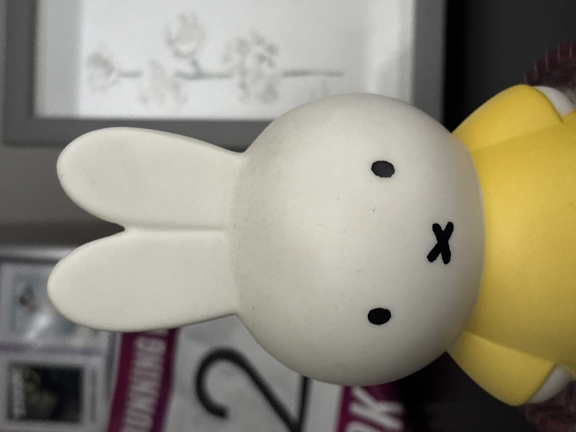 The image displays a white Miffy character figure, depicted from the chest up, positioned in the foreground and center. The figure features two prominent, rounded ears, black dot eyes, and a black 'x'-shaped mouth. It is wearing a plain yellow short-sleeved top. The background is out of focus. To the left, a portion of a white rectangular object is visible, displaying a magenta strip with the word "RUNNING" in white capital letters. Below this, a large black numeral "2" is present, indicating a potential race bib. Further left and upward, another blurred, framed item is partially discernible. To the right of the Miffy figure, a grey-framed picture or artwork is partially visible, containing a faint, light-toned botanical illustration against a white background, depicting multiple stems and blossoms. All objects are arranged on a dark, flat surface, suggesting an indoor setting within the city of Manchester, United Kingdom. No individuals, actions, or direct interactions are observed.