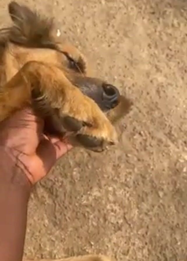 A brown dog lies on its back on a cracked, tan-colored surface, possibly concrete or dry earth. A person with dark skin is holding the dog's paw and gently moving it. The dog appears relaxed, with its eyes closed. The light is bright, suggesting it's daytime. The background is uniform, with the cracked surface filling the frame. The focus is primarily on the dog and the hand interacting with its paw.
