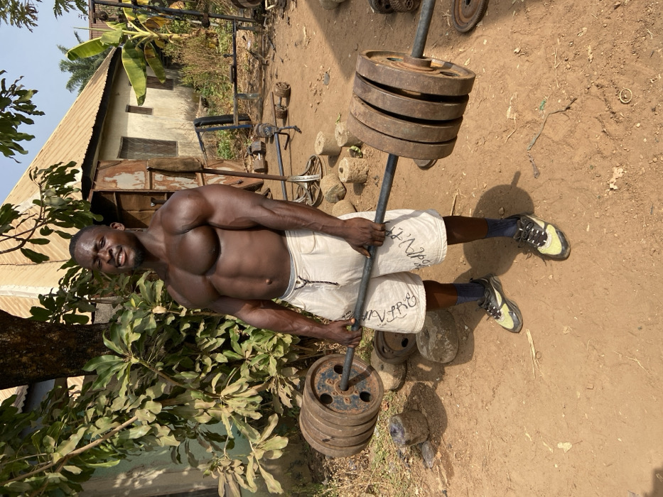 A dark-skinned, muscular male, shirtless and wearing light-colored shorts, dark socks, and black and neon-yellow athletic shoes, stands outdoors on red-brown dirt, holding a barbell with both hands. He is smiling and looking directly at the camera. The barbell is loaded with multiple rusty, circular weight plates on each end. In the background, to the right of the subject, are scattered concrete weight blocks and rudimentary metal gym equipment, including a bench press frame and other structures. A single-story building with light-colored walls and a corrugated metal roof is visible behind the equipment. To the left, a large tree with green foliage partially obscures another building. The scene is illuminated by direct sunlight, casting distinct shadows. This location is within the city of Akwanga, Nigeria.