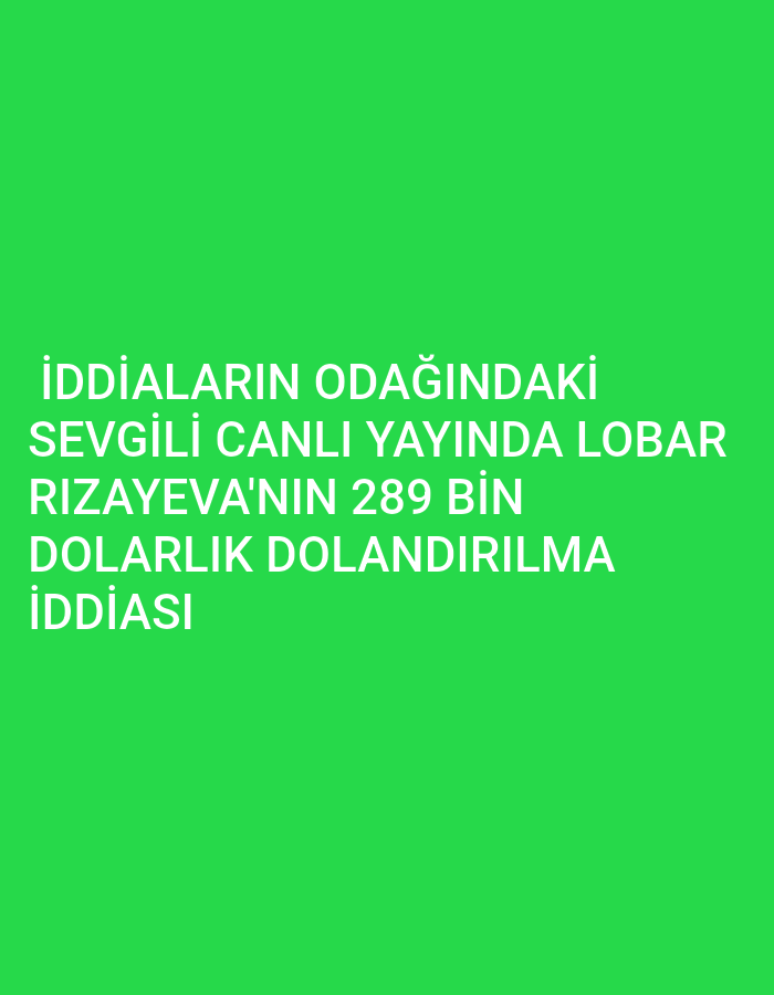 The image displays a bright green background with white Turkish text centered in the lower half. The text states: 'İDDİALARIN ODAĞINDAKİ SEVGİLİ CANLI YAYINDA LOBAR RİZAYEVA'NIN 289 BİN DOLARLIK DOLANDIRILMA İDDİASI', translating to 'The claim of Lobar Rizayeva being defrauded for 289 thousand dollars in a live broadcast, with her lover at the center of the allegations.' This information pertains to an event occurring in the city of Yangi-Khayat, Uzbekistan. The image itself is a text-only graphic and does not visually depict any individuals, objects, actions, or specific environmental features.