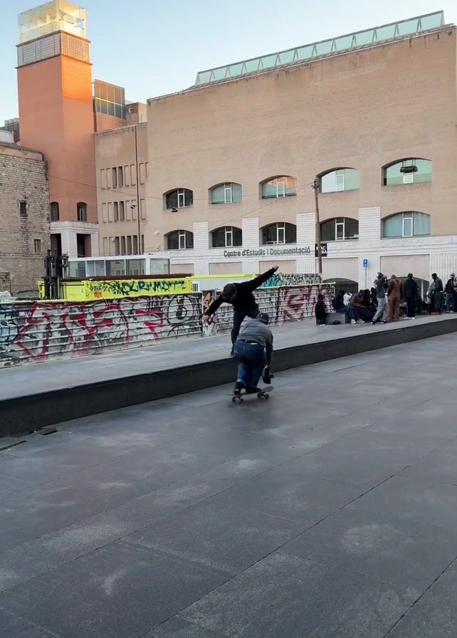 Two skateboarders are in a public square in front of a building with graffiti and signs that say "MACBA