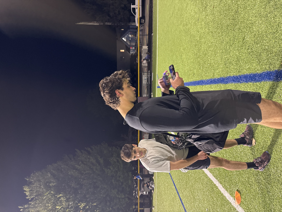 The image depicts two males on an artificial turf sports field at night in Newton, United States. The primary subject, positioned in the foreground on the right, is a male with curly dark hair, wearing a dark long-sleeved athletic shirt and dark shorts. He is engaged with a black smartphone in his left hand and a small purple electronic device in his right, looking downwards at the phone. Slightly behind and to the left of him stands a second male with dark hair, wearing a white short-sleeved t-shirt, dark shorts, and dark athletic shoes. He holds a black duffel bag resting near his left leg and is looking towards the primary subject. The field is green artificial turf marked with white and blue lines; an orange cone lies on the turf in the mid-ground. In the background, beyond a perimeter fence, a treeline, a building with illuminated windows, a flagpole, and a white pickup truck are visible under artificial lighting. Several indistinct figures are present further back on the field.