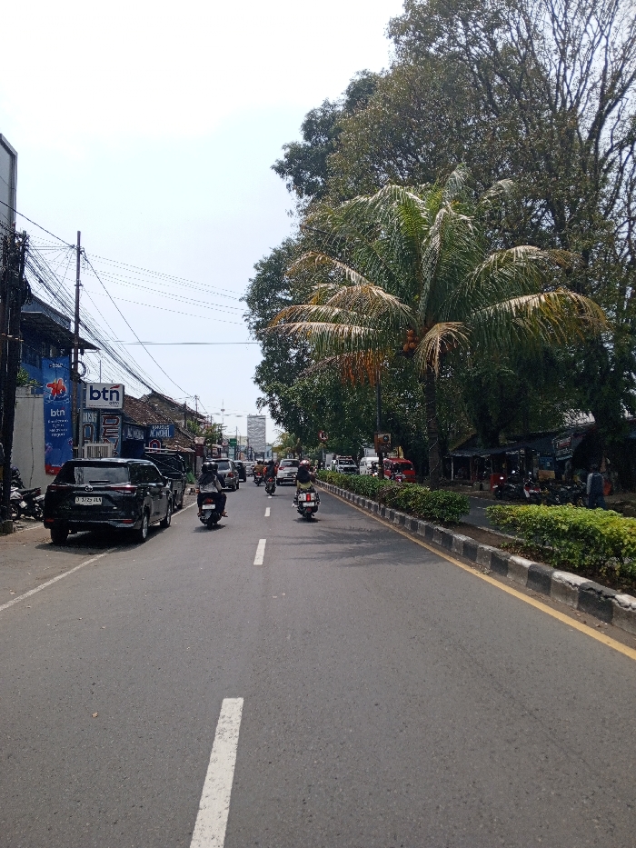 The image depicts a daytime street scene. A multi-lane asphalt road occupies the foreground, marked with a white dashed center line and a solid yellow line adjacent to a black and white painted concrete curb on the right, which borders green shrubbery. Traffic, primarily motorcycles with helmeted riders and cars, moves away from the viewer. A black SUV, license plate J 3725 JIN, is parked on the left shoulder. Buildings line the left side of the street, featuring dense overhead utility wiring and a prominent blue sign for "BTN atm". A large palm tree bearing coconuts stands on the right, backed by dense green foliage. Further down the road on the right, obscured market stalls are visible under trees. The sky is bright and clear. Visual evidence, including the "BTN" bank and the 'J' prefix on the license plate, indicates this location is in Indonesia, specifically consistent with East Java, not Multhan, India.
