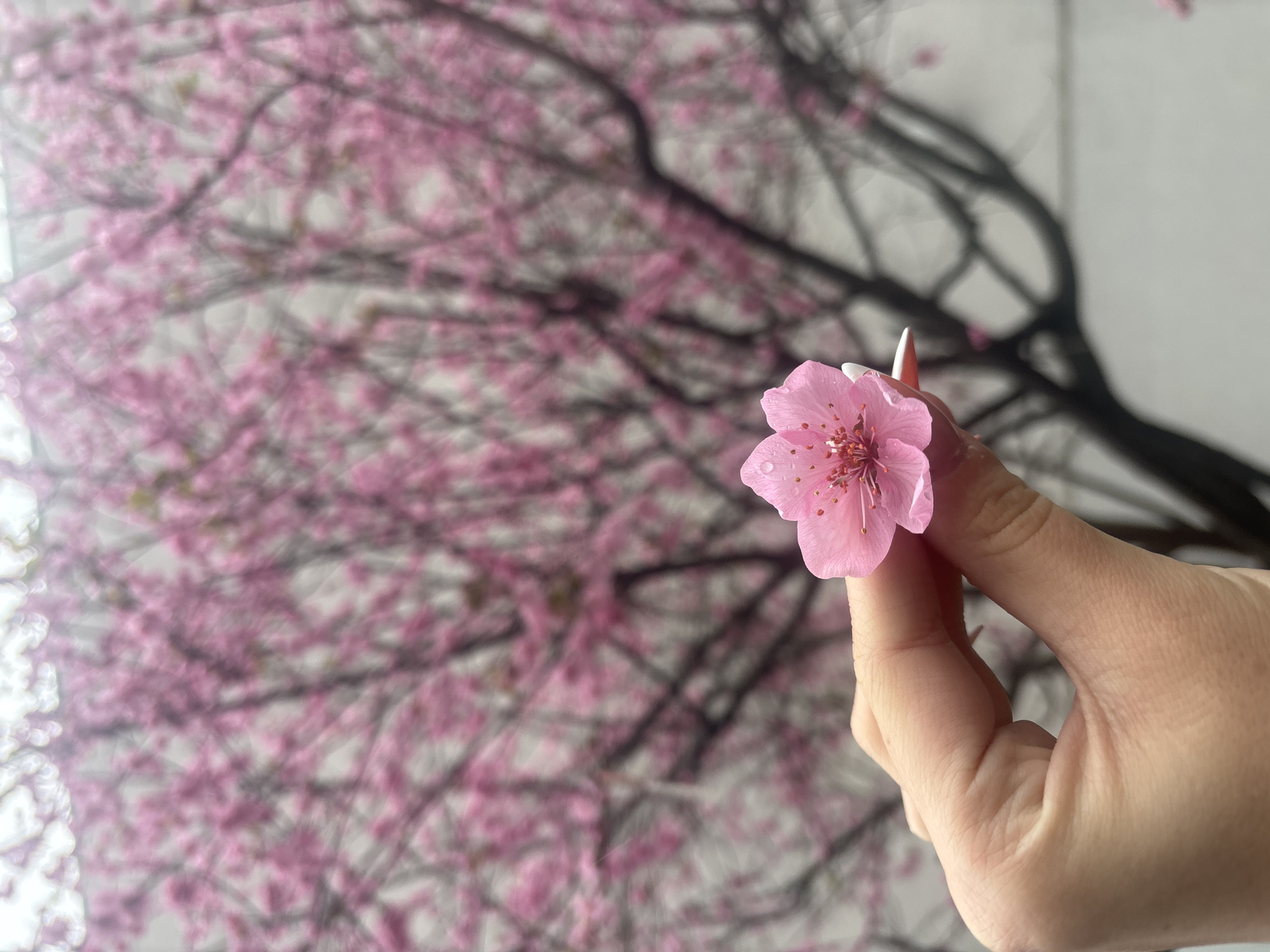 - "A person's hand holds a single pink blossom in the foreground, with a larger, blurred tree filled with similar pink blossoms in the background" by FM-KrfD33, licensed under CC BY 4.0