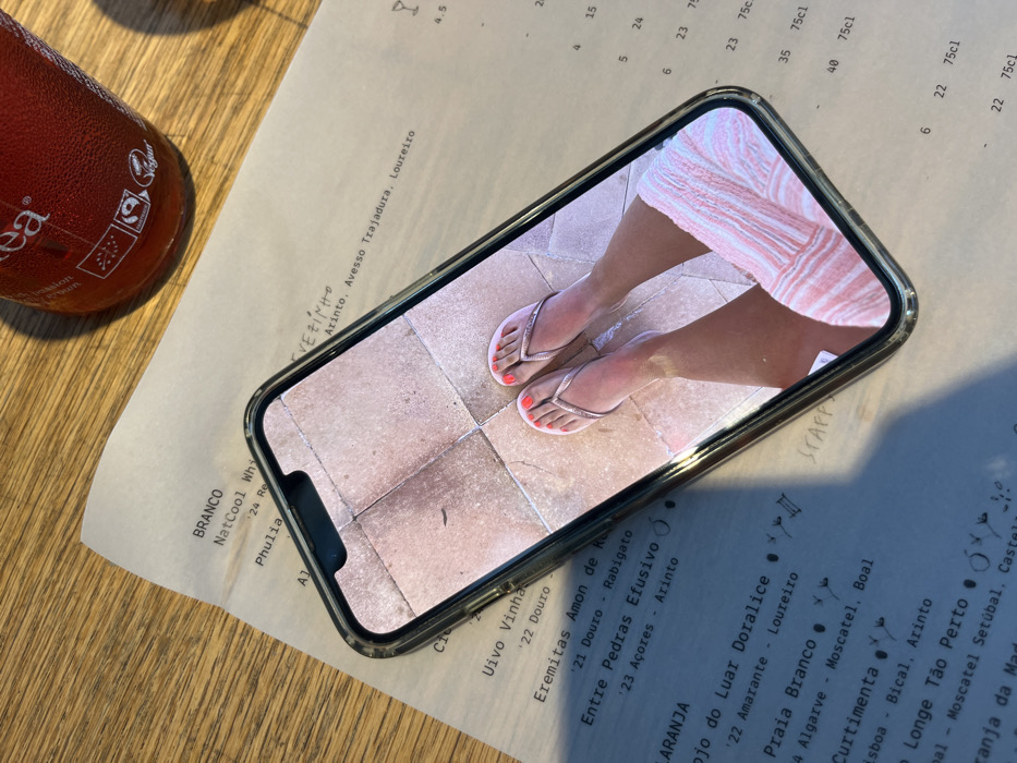 An overhead image displays a light-colored wooden table. A beige paper menu, written in Portuguese and listing wines ("BRANCO," "TINTO," "LARANJA") with handwritten notations including "STAFF," is visible. Centered on the menu is a black-cased smartphone, likely an iPhone, its screen illuminated. The screen shows a close-up image of a person's lower legs and feet, which are tanned and adorned with bright orange-red toenail polish. The person is wearing light pink, glitter-strapped flip-flops and a portion of a light pink and white striped garment is visible on the right. The feet are positioned on light-colored square paving stones. In the upper right of the table, a clear glass or plastic cup containing a reddish liquid, possibly iced tea, with visible condensation and "ORGANIQUE," "Vegan" labels, is present. The exact location within Lordelo do Ouro e Massarelos, Portugal, cannot be determined from the provided image.