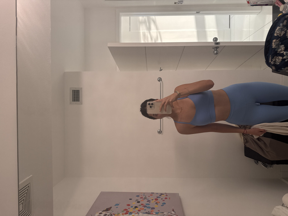 A woman is photographed in a mirror wearing a blue athletic set. The set consists of a sports bra and leggings. Her phone covers her face. A painting sits on the floor, while clothes hang in the background. The room is white and includes a small vent, a towel rack, and a window. A patterned bag is visible.