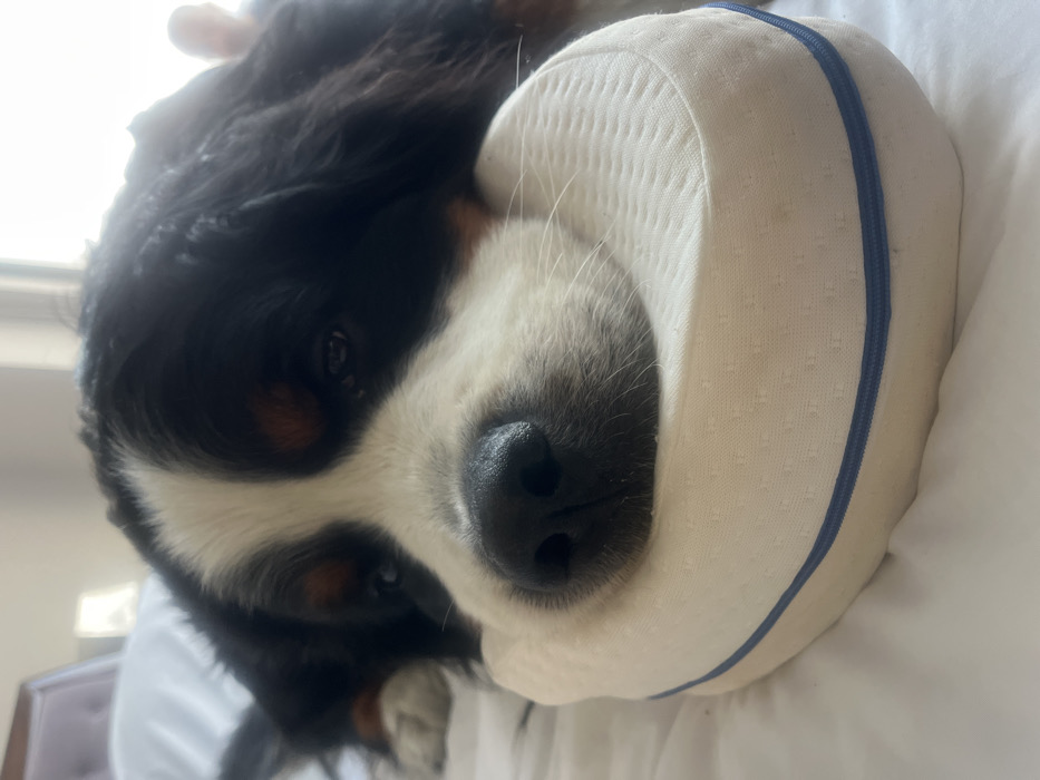 The image displays a Bernese Mountain Dog, characterized by black, white, and tan fur, positioned on white bedding. The dog's head rests upon an off-white, textured cushion with blue piping, which occupies the lower-center of the frame. Its eyes are partially open. The background reveals a dark headboard and a brightly lit window to the right, indicating an indoor, daytime setting. The scene is situated in Interlomas, Mexico.