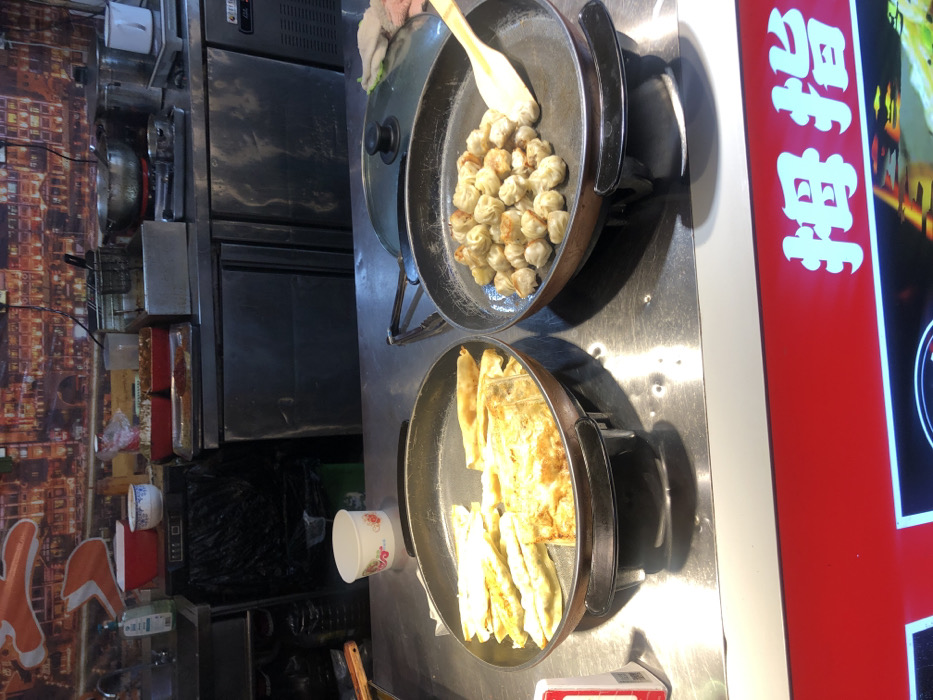 Two pans on a metal surface contain food. The top pan holds cooked dumplings, being stirred with a wooden utensil. Below, the second pan has fried dumplings or potstickers arranged inside. A paper cup sits beside the lower pan. A red sign with white Asian characters is visible to the right. A kitchen and counter setup is seen in the background.