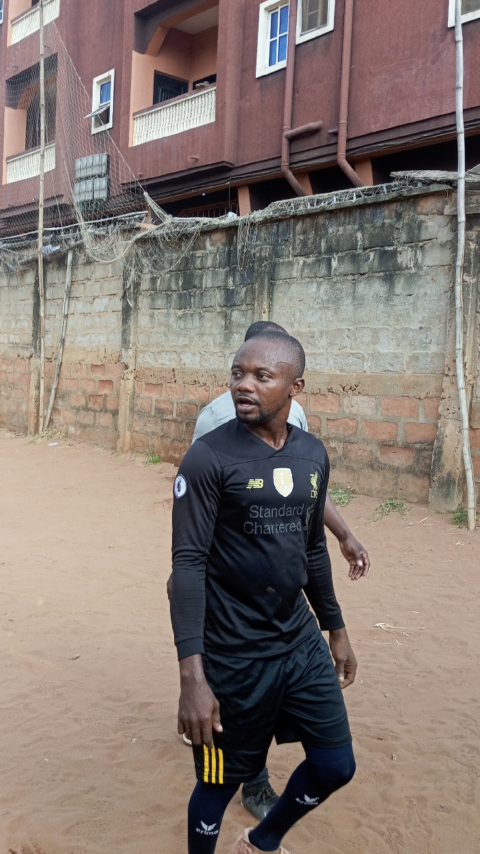 The image captures an outdoor scene in Onitsha, Nigeria, centered on a man in athletic attire