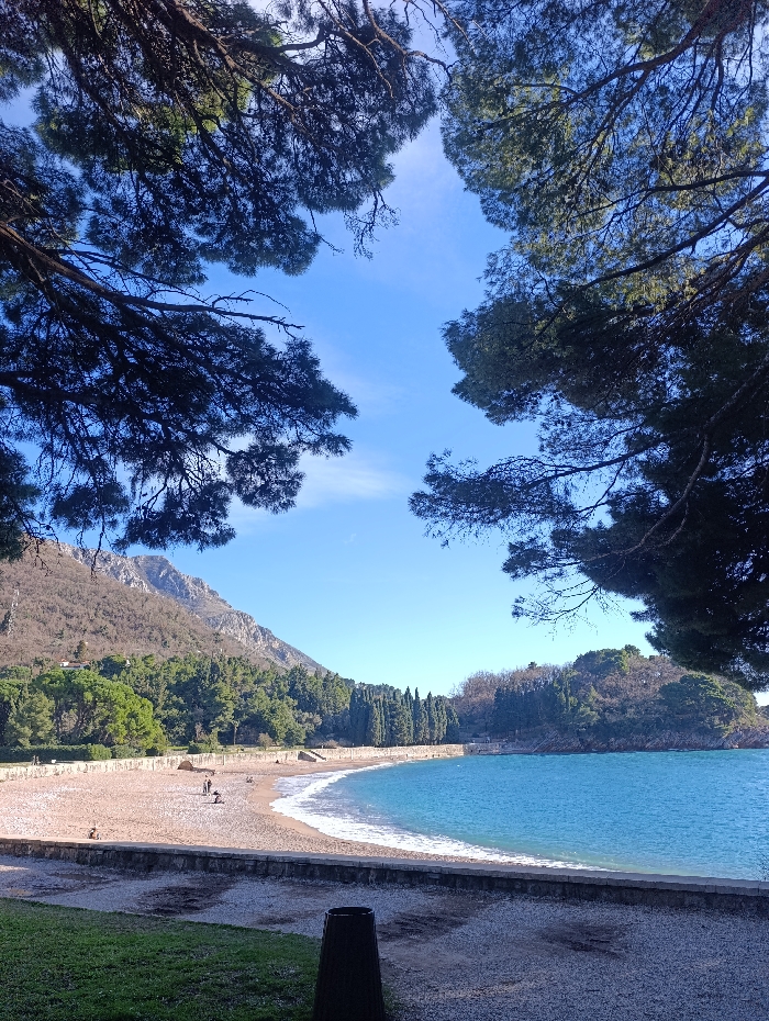 A scenic view framed by trees reveals a beach with clear turquoise water. A stone barrier separates the beach from grassy areas. People dot the sandy shore. A tree-covered peninsula extends into the water, while a mountain rises in the background under a blue sky with wispy clouds.