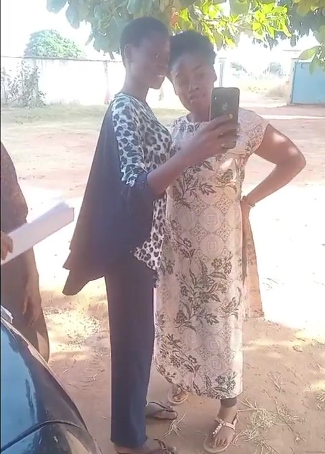 Two women pose for a selfie taken with an iPhone on a sunny day. They stand close together near a dark car and a tree. A third person, wearing a mask, stands to the side, holding papers. The woman on the left has short hair and wears a leopard-print shirt with dark pants and sandals. The woman on the right has her hair up and wears a floral dress with leggings and sandals. They interact, smiling and adjusting their poses for the photo. The setting appears to be outdoors, with a building visible in the background and a dirt ground covered with leaves.