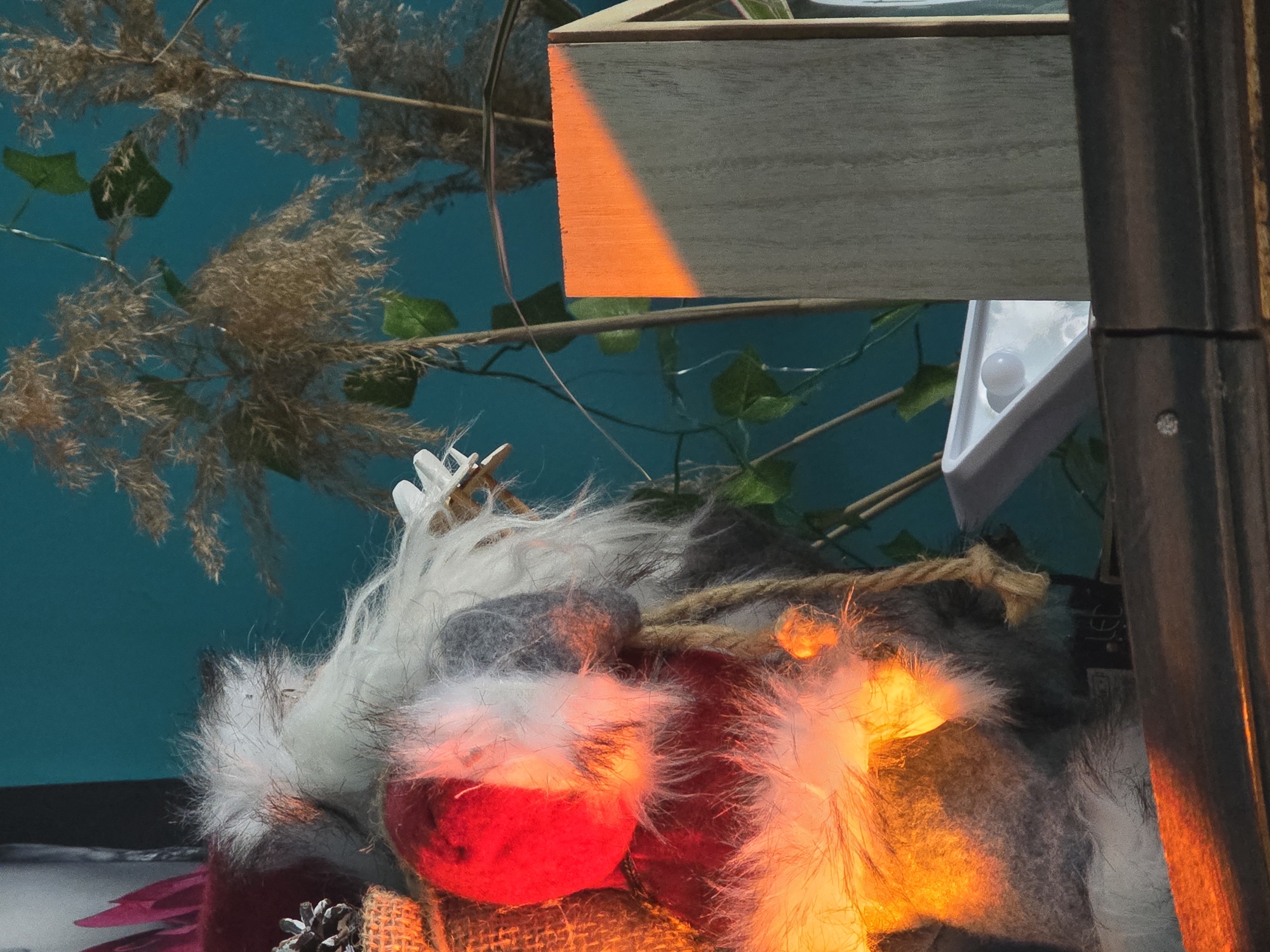 decorative arrangement, possibly indoors. Elements include pampas grass and artificial green leaves against a teal background. A wooden box with an orange-lit edge is partially visible at the top. Below, there's a composition with fur-like material, a red sphere, and an orange-lit object. A pinecone rests at the bottom, and a burlap-like texture is also present. The right side is partially obscured by a dark vertical element, possibly a structural beam. The image provides no information about Malko Tarnovo, Bulgaria.