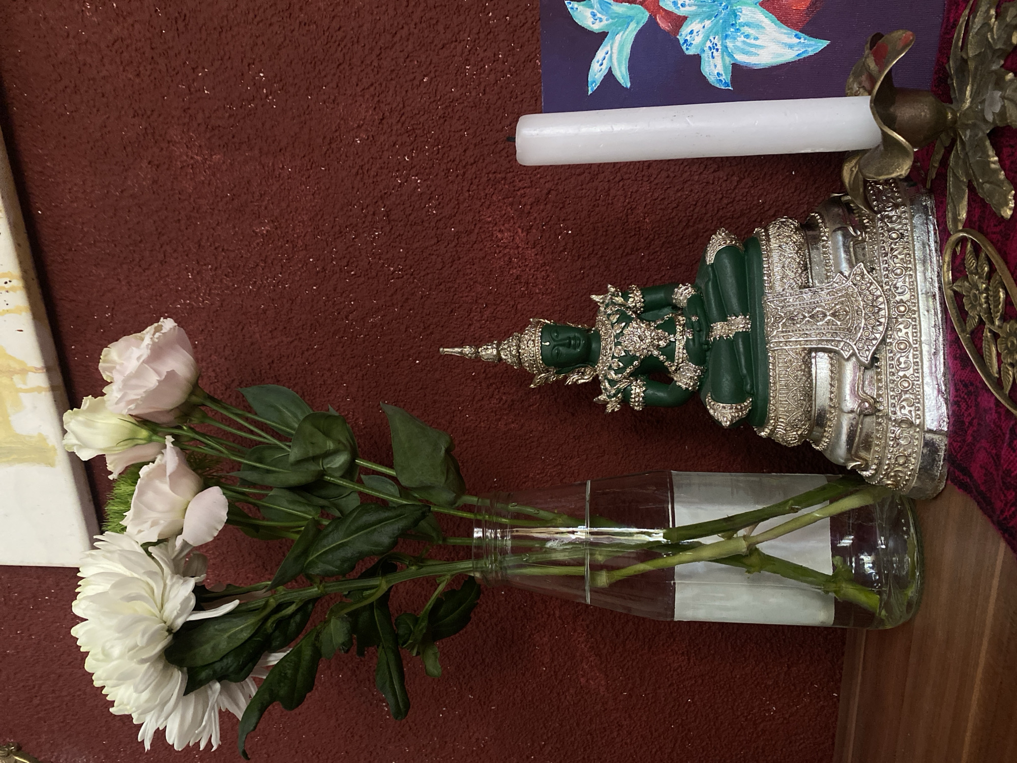 The image displays an indoor still life arrangement on a dark wooden surface against a textured dark red wall. A clear glass bottle, filled with water, holds a bouquet of flowers on the left side, consisting of several white chrysanthemums and multiple pale pink Eustoma blooms with prominent green stems and leaves. In the center, a green Buddha statue in a meditative posture is situated on an ornate, silver-colored tiered base, detailed with intricate patterns. The statue itself features silver-colored adornments on its crown, chest, and arms. To the right, an unlit white candle stands upright in a brass-colored, leaf-shaped candle holder. Partially visible behind the candle is a small canvas or board displaying a painting of blue and red floral elements on a dark purple background. A brass-colored decorative object with a floral design rests on the wooden surface in front of the candle holder. A piece of dark red patterned textile is visible underneath the Buddha statue and candle. The specific location within the city of Kunje, Montenegro, is not visually identifiable from the provided image.