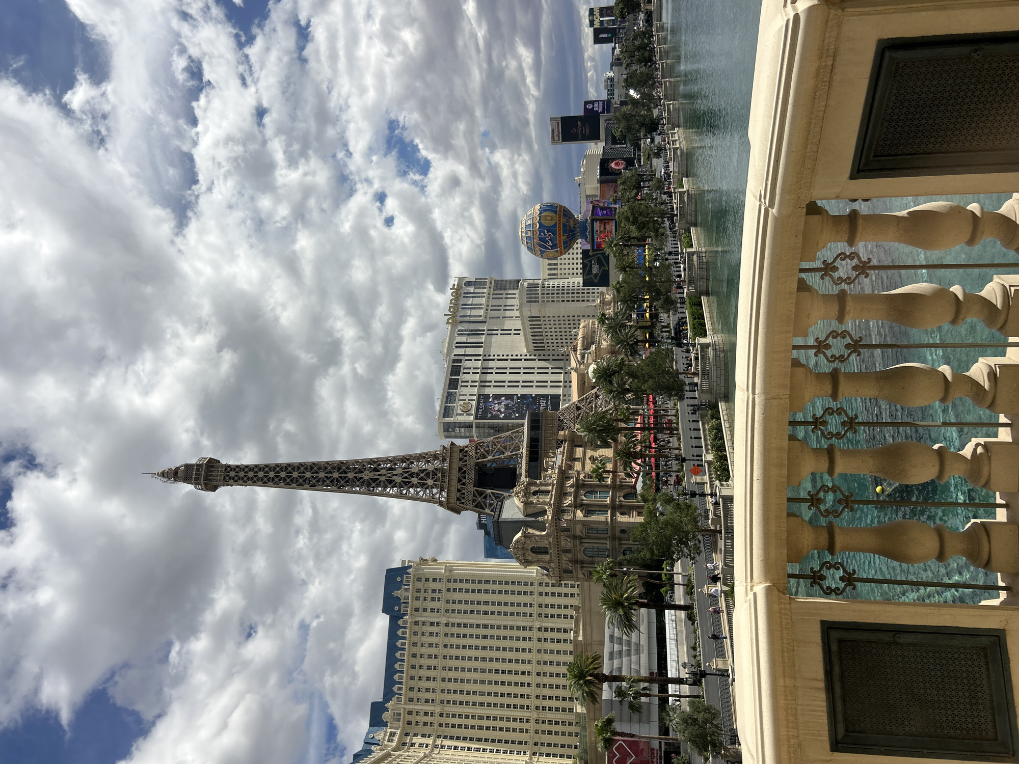 This is an eye-level, outdoor, daytime shot of the Las Vegas strip in Paradise, Nevada, United States of America. The Eiffel Tower replica is the main focal point, positioned in the left of the frame against a sky filled with white and gray clouds. To the right of the Eiffel Tower are other prominent hotel and casino buildings, and a balloon. Palm trees are visible along the street. The right side of the frame features a stone balcony with balustrades, providing a partial view of a body of water, likely one of the water features along the strip. Pedestrians and vehicles can be seen moving along the street.