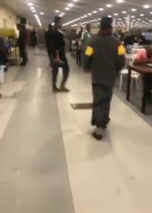 brightly lit hallway in a building. The floor is a light-colored tile with linear, darker inlays. Numerous individuals, mostly men, are walking along the hallway in different directions. Many are wearing dark clothing, with a few exceptions, such as someone in a light-colored garment and another person with yellow armbands. Some tables and chairs are visible along one side of the hallway. The camera is moving, presumably being carried by someone walking, and the view is slightly shaky.