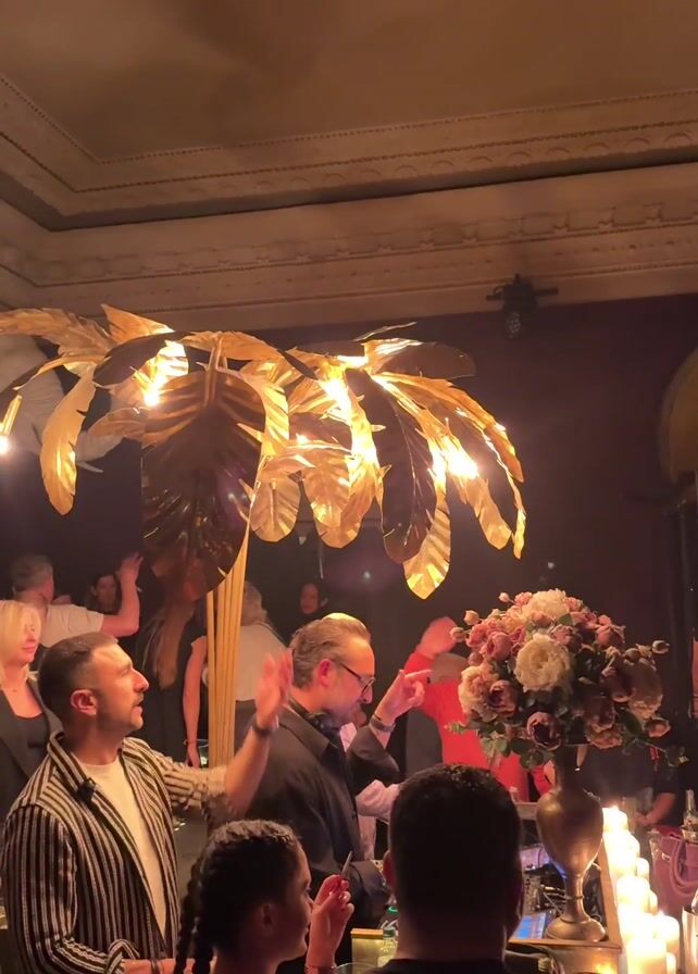 crowded indoor party scene. A DJ in glasses and a black shirt stands behind a table of equipment, seemingly playing music. Several partygoers are gathered around him, some with their hands raised in the air, enjoying the music. A man in a black and white striped shirt is clearly visible, also raising his hand. The lighting shifts between warm yellow and cool blue tones, highlighting a large, decorative golden tree-like structure above the crowd. A vase filled with flowers sits on the table near the DJ. The ornate ceiling and wall decorations suggest a stylish venue.