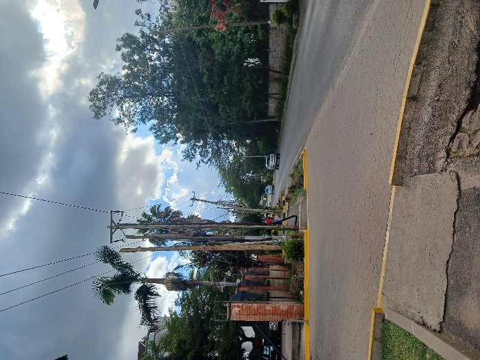 The image depicts a paved street in Nairobi, Kenya, located at coordinates -1.29 latitude and 36.784 longitude. The street is lined with trees and shrubs, with a brick wall on the left side. There are power lines running overhead. A single person walks away from the camera on the right side of the street. The sky is partly cloudy. There are two cars parked in the distance, one on the right side of the street and the other on the left side. The road is relatively empty.