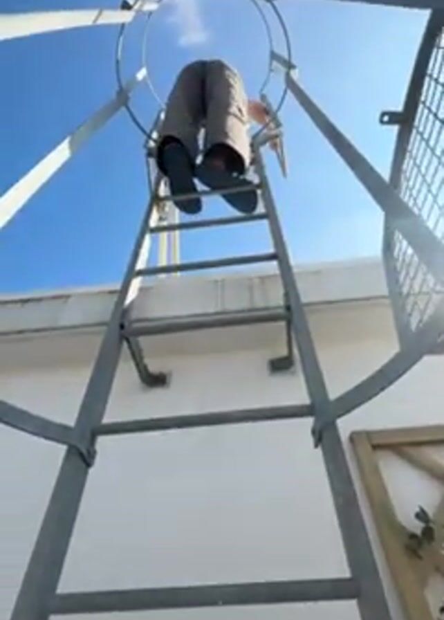 A person is climbing a grey metal ladder attached to the side of a white building