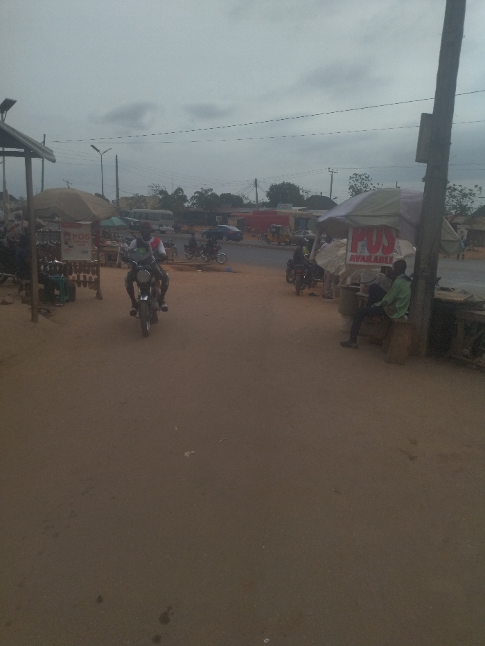 street scene in Junction, Nigeria (latitude: 8.958, longitude: 7.551). The scene is taken from a slight elevation on a dirt road, looking towards the street. The sky is overcast with a hint of blue, with the sun obscured. There are trees lining the street, and buildings in the distance. A man is riding a motorcycle on the right side of the road, heading toward the viewer. There are two makeshift stalls in the foreground, both labeled with signs that read "POS AVAILABLE," suggesting they are selling goods or providing services. Several people are standing or sitting in the vicinity, with a few motorcycles parked near the stalls. The ground is a light brown dirt, and there are some scattered pieces of trash on the ground. The overall atmosphere is somewhat dusty and quiet. The scene appears to be a typical street scene in Junction, with a mix of street vendors, locals, and motorcycles, which is common in the area.