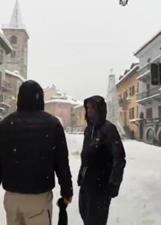 Two individuals stand in a snow-covered town square during a heavy snowfall. The person on the left wears a black jacket, tan pants, and carries a green shopping bag. The person on the right is dressed in black winter clothing with a hood up. In the background, there are buildings with European-style architecture, a church steeple, and a tall, decorative Christmas tree-like structure. The scene is dominated by the white snow and overcast sky.