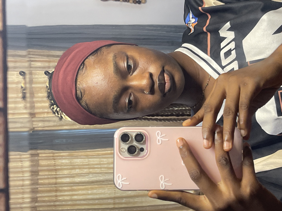 This image, captured in Ado, Nigeria, depicts an individual taking a mirror selfie indoors. The subject is a person with dark skin, shown from the chest up, wearing a maroon fabric headband across their forehead. Braided hair is visible on their left side, extending over the shoulder. A small silver-toned nose ring is present on the right nostril. Their eyes are directed slightly downward and to the right, and their lips are closed. They are dressed in a dark-colored garment, possibly a jersey, featuring white trim on the collar and shoulder, with a partially visible multi-colored logo and white text. The individual holds a light pink smartphone with their right hand, which features a decorative case with multiple white bow motifs and a triple-lens camera module with silver-colored rings. The background consists of light brown or beige vertical blinds or curtains.