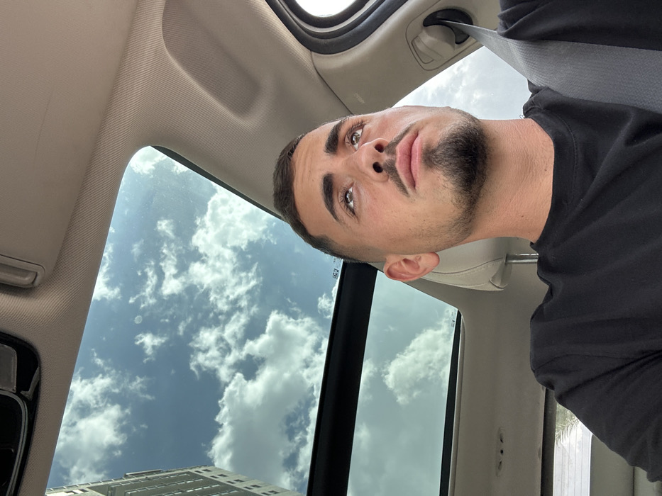 An image captured from inside a vehicle in Beer Yaakov, Israel, shows a young adult male occupant. The male, with light skin, short dark hair, a goatee, and dark eyes, is wearing a black t-shirt and secured by a dark seatbelt across his chest. He is seated in the vehicle, looking upwards and slightly to his left (viewer's left). A light-colored vehicle headrest is visible behind him, and the vehicle's beige-colored headliner frames the upper portion of the scene. Above the male, a panoramic sunroof reveals a blue sky with scattered white cumulus clouds. To the far left, a portion of a tall, light-colored multi-story building is visible against the sky, outside the vehicle.
