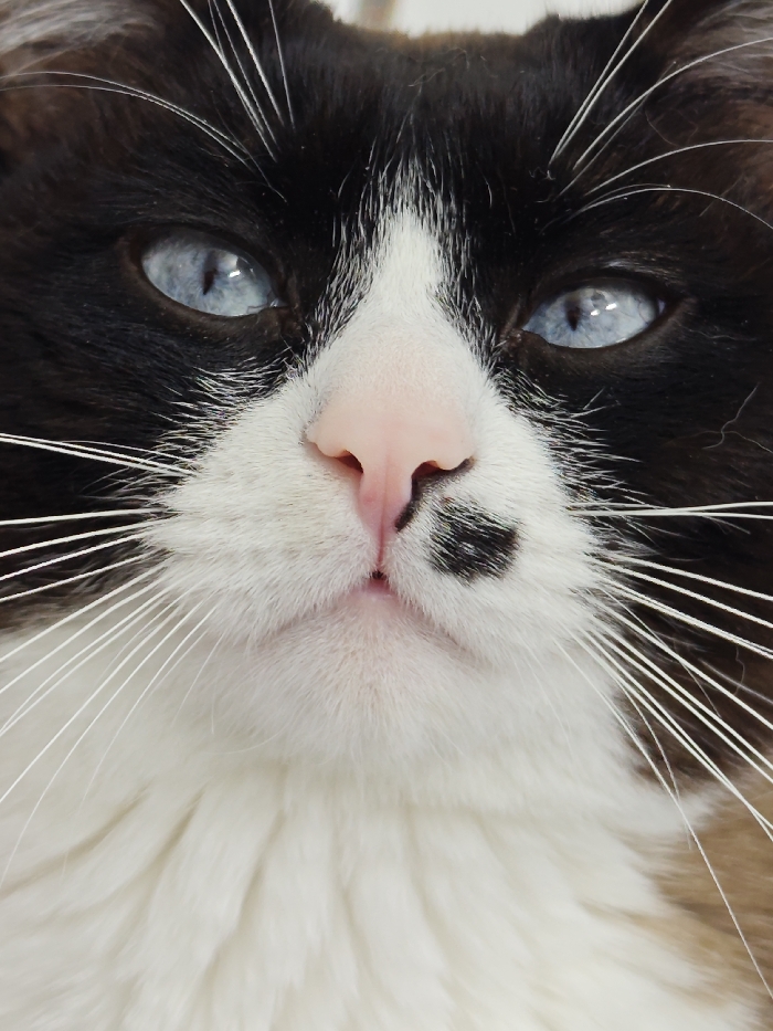 A close-up image depicts a cat's face, showcasing its light blue eyes, pink nose, and white whiskers. The fur around the nose and mouth is white, contrasting with the dark fur on the forehead. A small black spot is visible near the cat's nose. The chest is covered in soft, white fur. The overall image is sharply focused and highlights the cat's unique facial features.