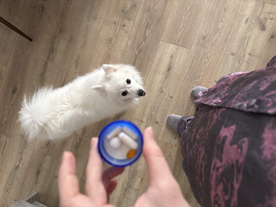 - "From an overhead view, a white fluffy dog with black eyes gazes up at a blue bottle filled with white and orange pills" by FM-GBY8N2, licensed under CC BY 4.0
