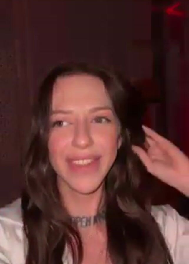 A young woman with long brown hair, fair skin, and a black choker that reads "OPEN" is dancing in a nightclub with red lighting. She is wearing a white button-up shirt over a black top. The club appears to be crowded with other people and is decorated with geometric light fixtures. The woman smiles and dances directly into the camera.