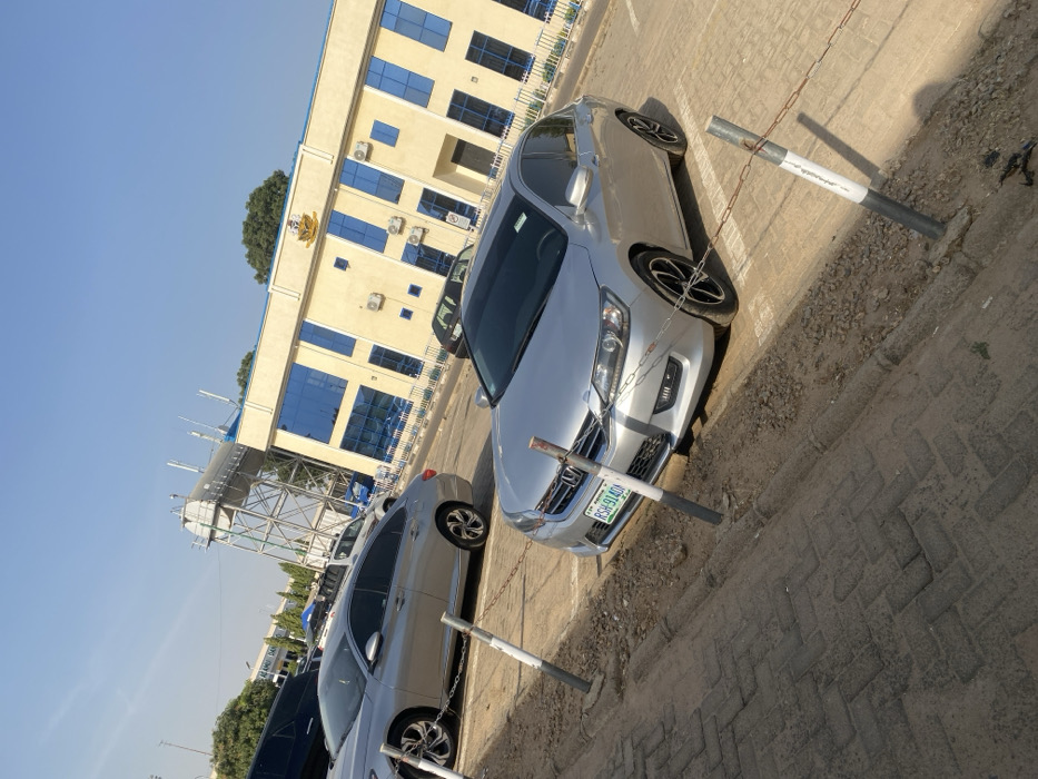 A silver Honda Accord sits parked in a designated area, defined by metal posts connected with chains