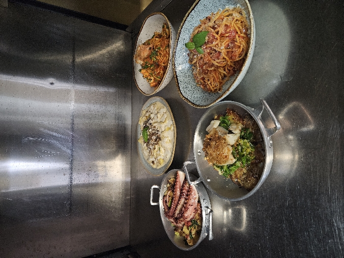 The image depicts five prepared food dishes arranged on a brushed metal countertop within a commercial kitchen or serving environment. A matching brushed metal surface forms the backdrop. In the foreground, from left to right: 1. A silver-colored metal pan with two handles contains multiple cooked octopus tentacles, characterized by a reddish-brown, seared appearance, resting on a base of grains or mixed vegetables. 2. Adjacent to it, a similar silver-colored metal pan with two handles holds a portion of white fish, possibly cod, topped with golden-brown breadcrumbs or seasoning. This is served over vibrant green leafy vegetables and a darker, possibly sauced, underlayer. 3. To the right, an oval-shaped ceramic bowl with a light-colored, speckled rim contains spaghetti in a red tomato sauce, garnished with grated white cheese and a single green basil leaf. In the background, from left to right: 4. A round, light-colored ceramic plate with a textured rim presents a pasta dish, possibly ravioli or gnocchi, covered in a creamy white sauce. Dark specks, consistent with ground pepper or herbs, are distributed over the dish, which is also garnished with a small green leaf. 5. To its right, a second oval-shaped ceramic bowl, identical to the one in the foreground, holds long pasta, such as spaghetti or linguine, tossed in a reddish sauce. A piece of cooked seafood, likely shrimp or a small fish portion, rests on top, alongside scattered green herbs. The metallic surfaces display minor scuffs, stains, and reflections. No individuals are present in the scene. The presentation suggests ready-to-serve dishes in a culinary establishment.