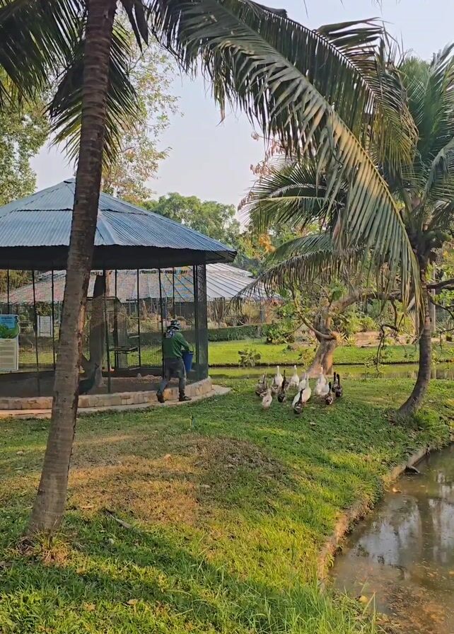 scene in what appears to be a park or garden-like area. A person dressed in dark clothing and wearing a green hat is walking towards a caged structure. Several ducks are standing on the grass near a small body of water. The area is surrounded by lush greenery, including palm trees. The cage-like structure has a bluish metal roof. The sky is lightly colored, suggesting it might be early morning or late afternoon.