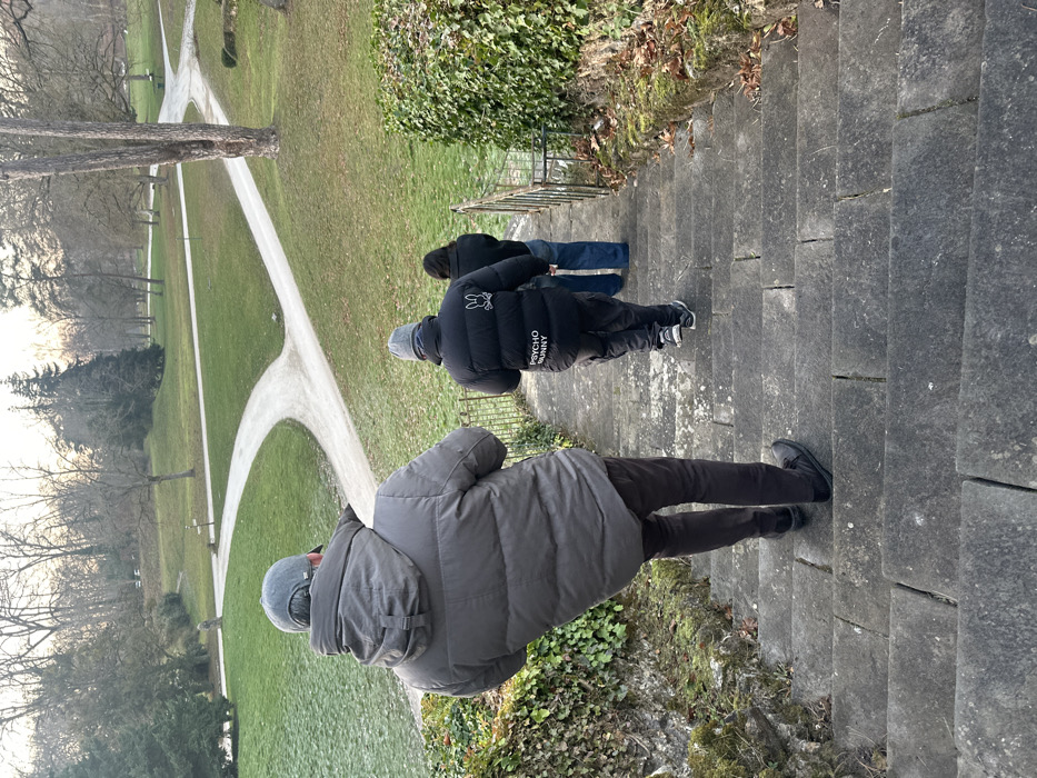 Three people are seen from an elevated perspective, standing on stone steps. One person wears a gray hooded jacket and dark pants. Another wears a black puffer jacket with "Psycho Bunny" printed on the back and is turned away from the camera. The third person is partially visible, wearing a dark jacket and jeans. A green lawn with bare trees is visible in the background. A path forks in the distance.