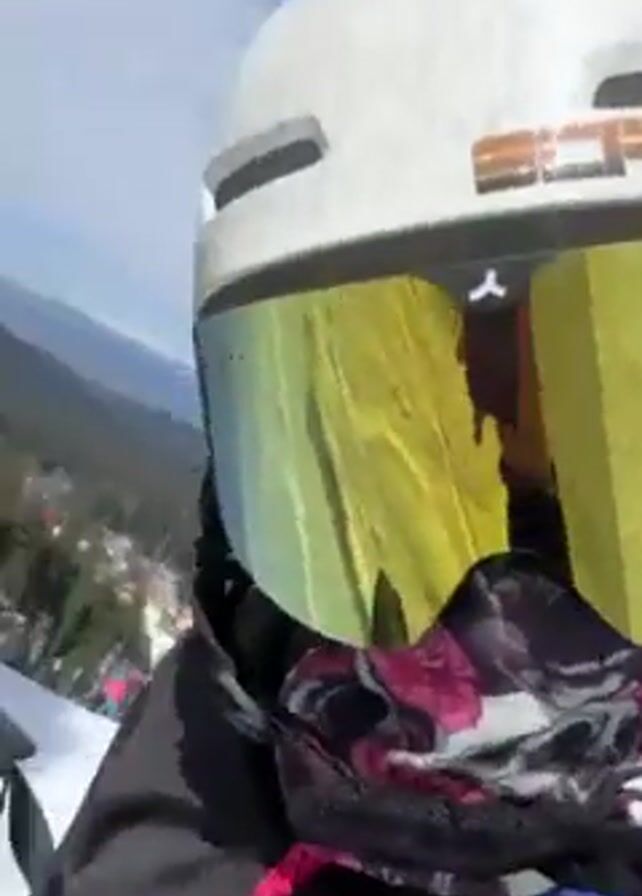 A person wearing a white helmet with the word "SCRATCH" on it, reflective yellow goggles, and a face mask with a skull and floral design is skiing down a snowy slope. The person is wearing a dark jacket with a pink zipper. Trees are visible in the background. The sky is blue with some clouds. The person appears to be filming with a camera pointed at themselves. They are holding ski poles.