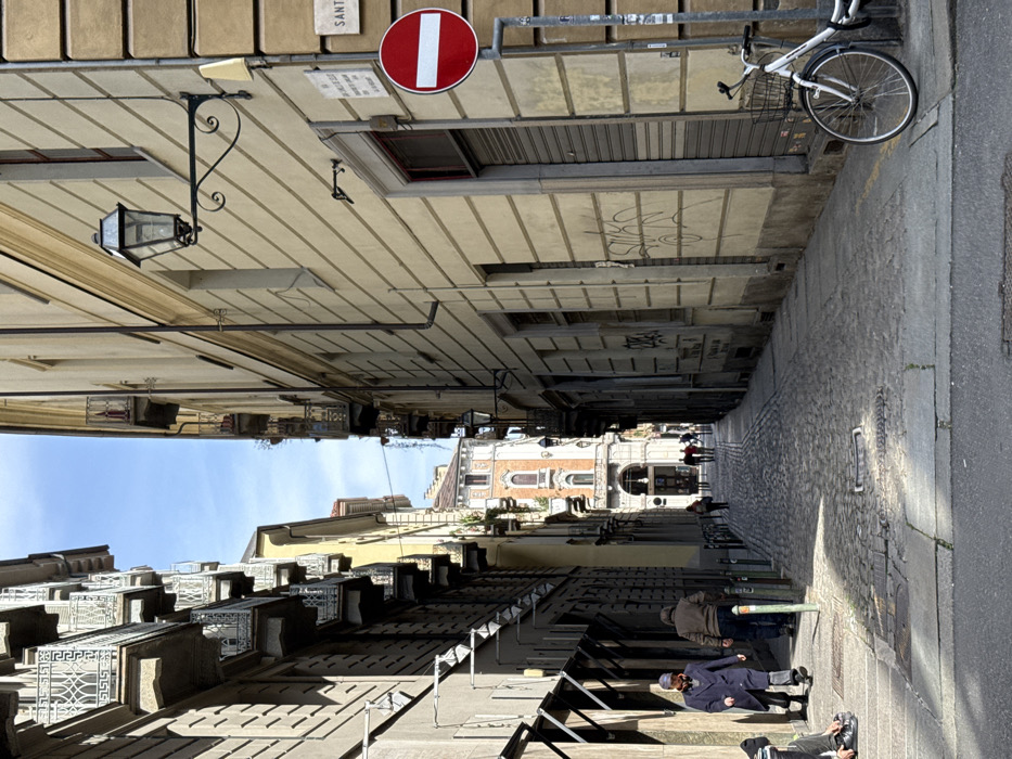 This image depicts a narrow, cobbled alleyway, identified as Via Santa Chiara in the historic center of Turin, Italy, observed during daylight hours under a clear blue sky. The perspective is looking down the street towards a distinctive reddish-brown building with an arched entrance at the far end. On the right side of the alley, a tall, pale yellow building with horizontal decorative banding features multiple windows; some are visible with closed grey metal roller shutters. Graffiti is present on the lower section of this wall. An ornate black metal street lamp is affixed to the building's facade. A white bicycle with a black front basket is parked upright against the building, secured to a grey pole. This pole also holds a red circular "No Entry" sign with a white horizontal bar, and a partial white street sign indicating "SANTA" and "CIRCOSCRIZIONE 1." A concrete sidewalk runs along this building. On the left side, a tall, grey building displays multiple ornate wrought-iron balconies on its upper floors. The lower section features several grey awnings or shelters projecting over a concrete sidewalk. Two individuals are walking away from the camera along this sidewalk: one male in a dark blue coat and a patterned scarf, followed by another male in a brown jacket and dark pants. A third person is partially visible, seated on the sidewalk in the bottom left corner of the frame. The central cobblestone street is partially illuminated by sunlight, with shadows cast along both sides. Short, dark grey bollards delineate the left sidewalk from the cobbled thoroughfare. Several additional pedestrians are visible walking further down the alley towards the distant building.