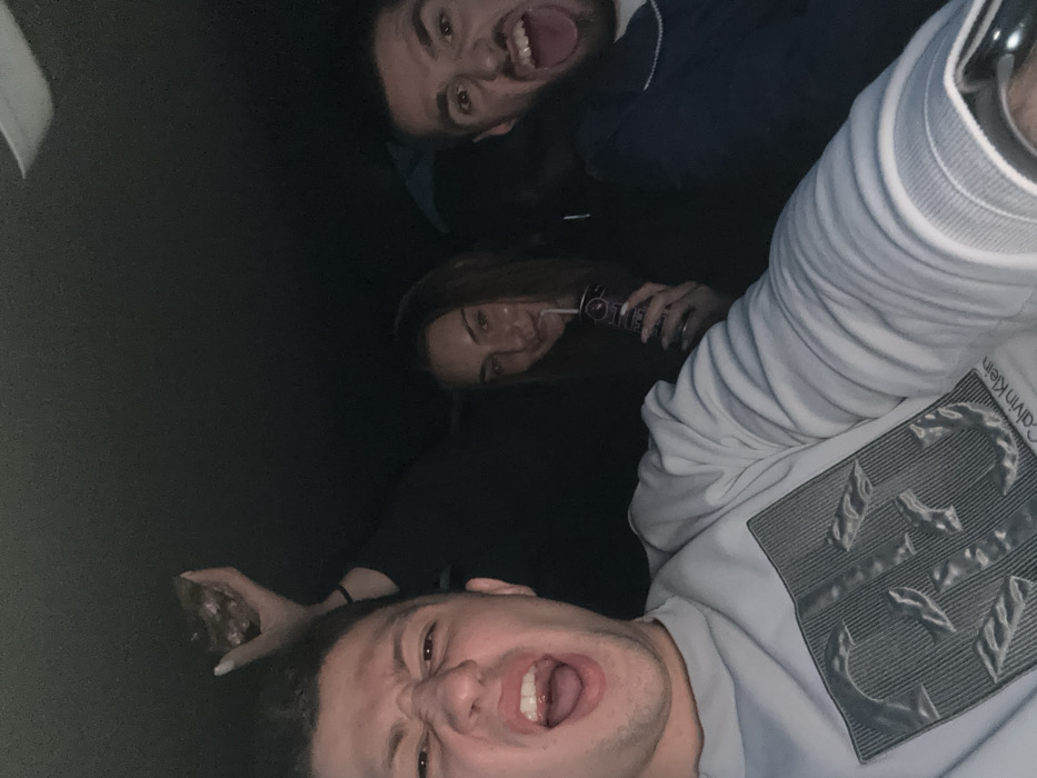 The image captures three young adults and a partially visible fourth individual inside a vehicle, likely a car, in a low-light setting