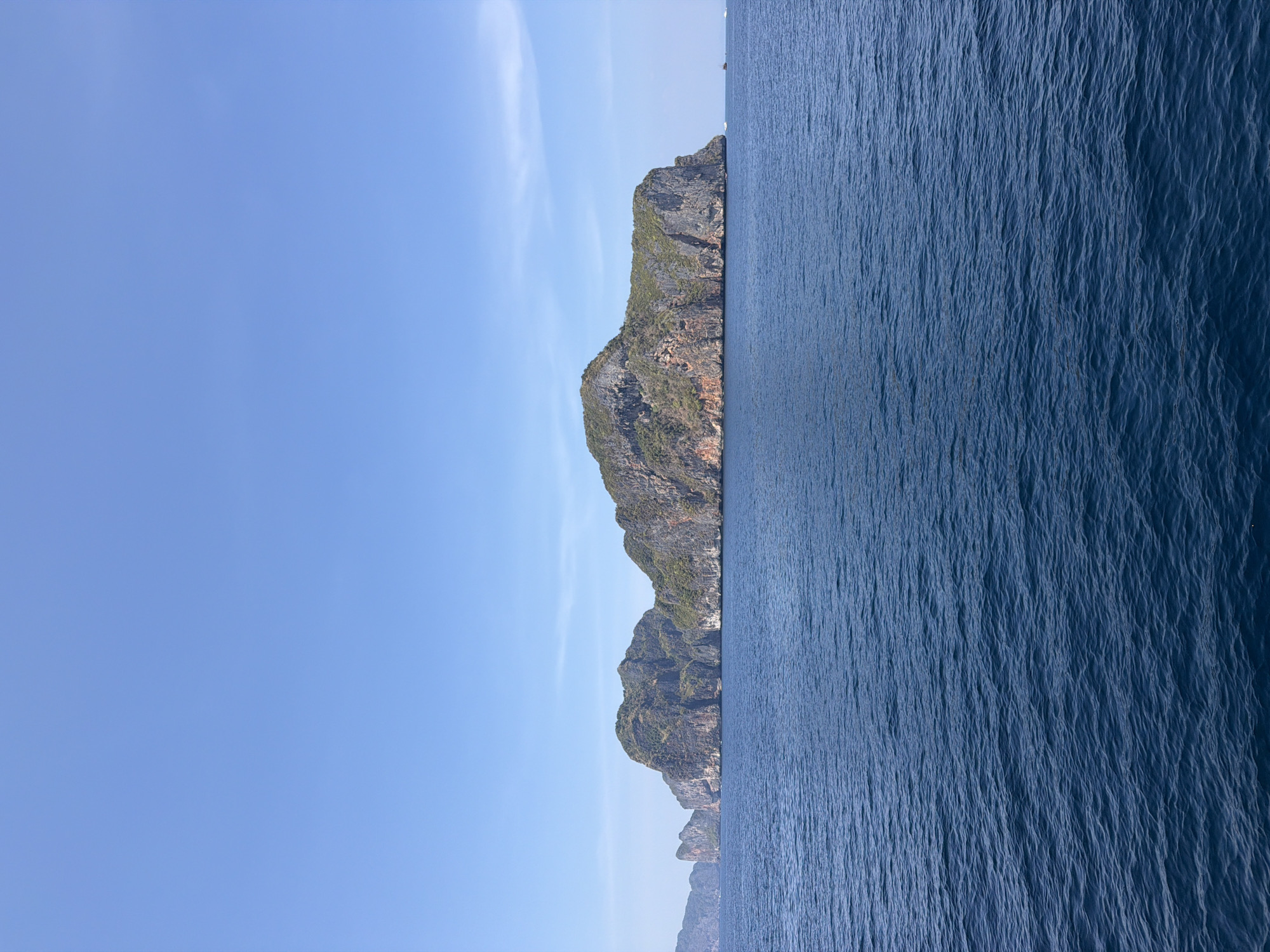 The image depicts a panoramic view of the Phi Phi Islands in Thailand, characterized by an expansive body of deep blue, rippled ocean water occupying the lower half of the frame. Dominating the midground are several prominent limestone karst islands, featuring steep, rugged cliffs topped with dense green vegetation. The central island is large, elongated, and exhibits exposed reddish-brown rock at its base. Smaller, similar islands are visible in the receding distance on both the left and right. The upper half of the image is filled with a clear, bright blue sky, exhibiting minimal, wispy cirrus clouds toward the upper right quadrant. Several small, white watercraft are discernible as distant specks near the horizon line adjacent to the islands. No individuals are visible, and the scene is static, presented under bright daylight conditions.