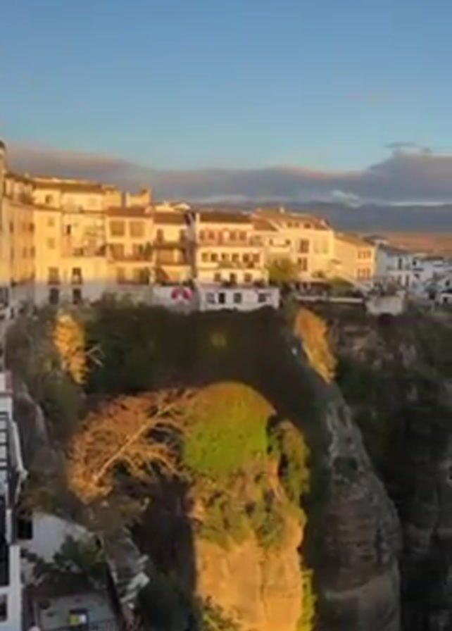 beautiful scenic view of Ronda, Spain. The camera slowly pans right to reveal the cliffs and the white buildings perched on the edge. The cliffs are covered in green vegetation. The sky is blue with some clouds and the sun is shining, casting a golden glow on the buildings and cliffs. In the foreground, there is a terrace with people sitting at tables. The mountains are visible in the distance.