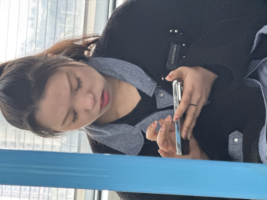 A woman is looking at her smartphone, eyes closed. She wears a black fuzzy jacket over a gray collared shirt and a black shirt underneath. The jacket has a small tag that reads "yuefufulileeafs". She wears a thin gold ring on her left hand. Her fingernails are painted with a red, pink, and gold design. A blue railing appears in the foreground.