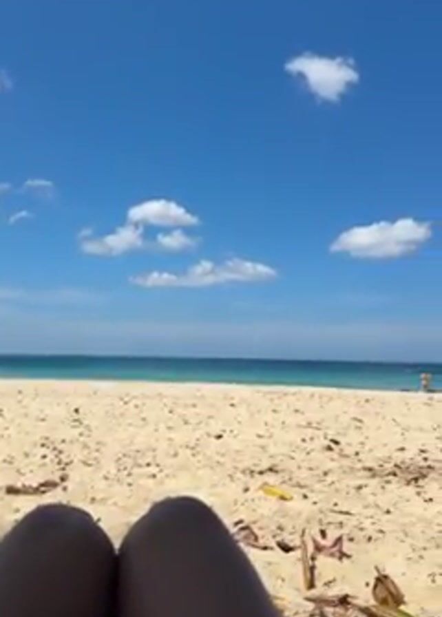 person's legs resting on a sandy beach on a sunny day with a blue sky and scattered clouds. In the distance, there is a view of the ocean, with a group of people standing near the shoreline. There are a few bits of debris scattered on the sand. The camera pans slightly to reveal a tree branch at the top of the frame.