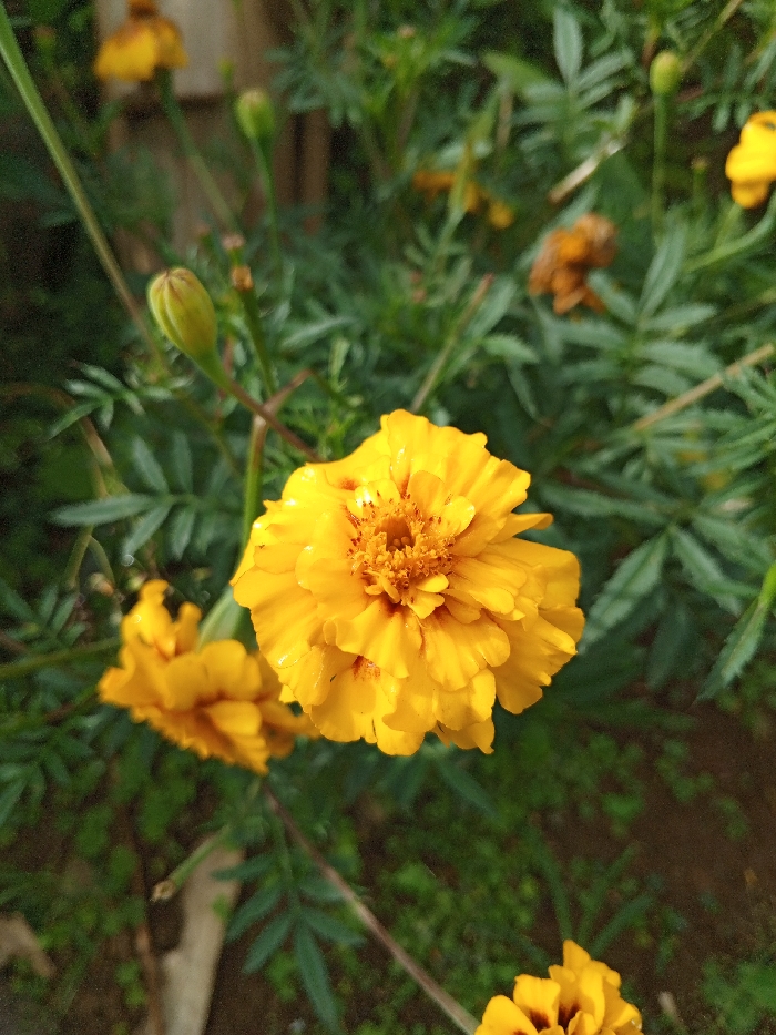 This image captures a close-up, eye-level perspective of a cluster of marigold flowers and foliage, located in Zowieta, Liberia. The primary subject is a vibrant yellow marigold, centrally positioned and sharply in focus. This flower displays numerous layered, bright yellow petals surrounding a dense, slightly darker orange-yellow disc florets center, which exhibits faint reddish-brown speckles. Small water droplets are visible on the petals of this main flower. To the immediate lower left, a second, less distinct yellow marigold flower is present, out of focus. Above the main flower and slightly to the left, a singular green marigold bud, elongated and closed, is visible on a thin stem. The background consists predominantly of blurred, rich green foliage with the characteristic deeply lobed leaves of marigolds. Within this soft background, several other yellow marigold flowers and buds are discernible, including a withered, brownish flower in the upper right portion of the frame. A partial view of another yellow marigold, showing a darker reddish-brown center, is present in the lower right corner, also out of focus. The ground beneath the plants appears as dark, moist soil with scattered, blurred green vegetation. A faint, vertical light-colored object is barely visible in the deeply blurred background, possibly a structural element or stake. Natural light illuminates the scene, casting subtle highlights on the flowers and foliage.