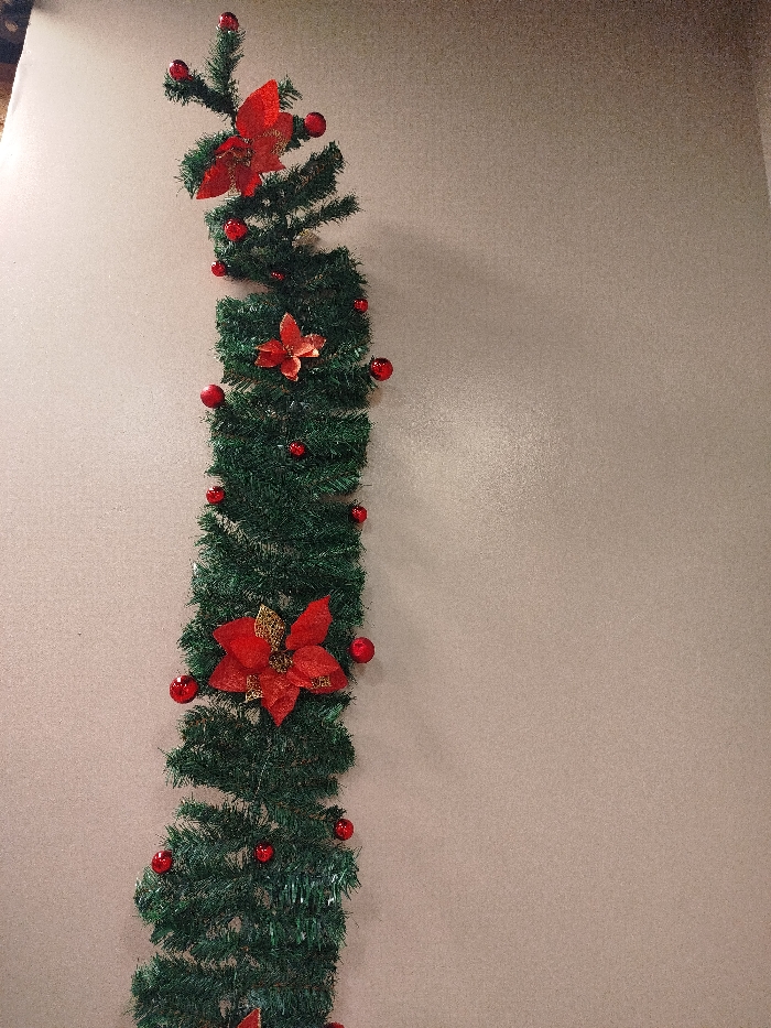 A green Christmas garland adorns a wall, featuring red poinsettias and small red ornaments